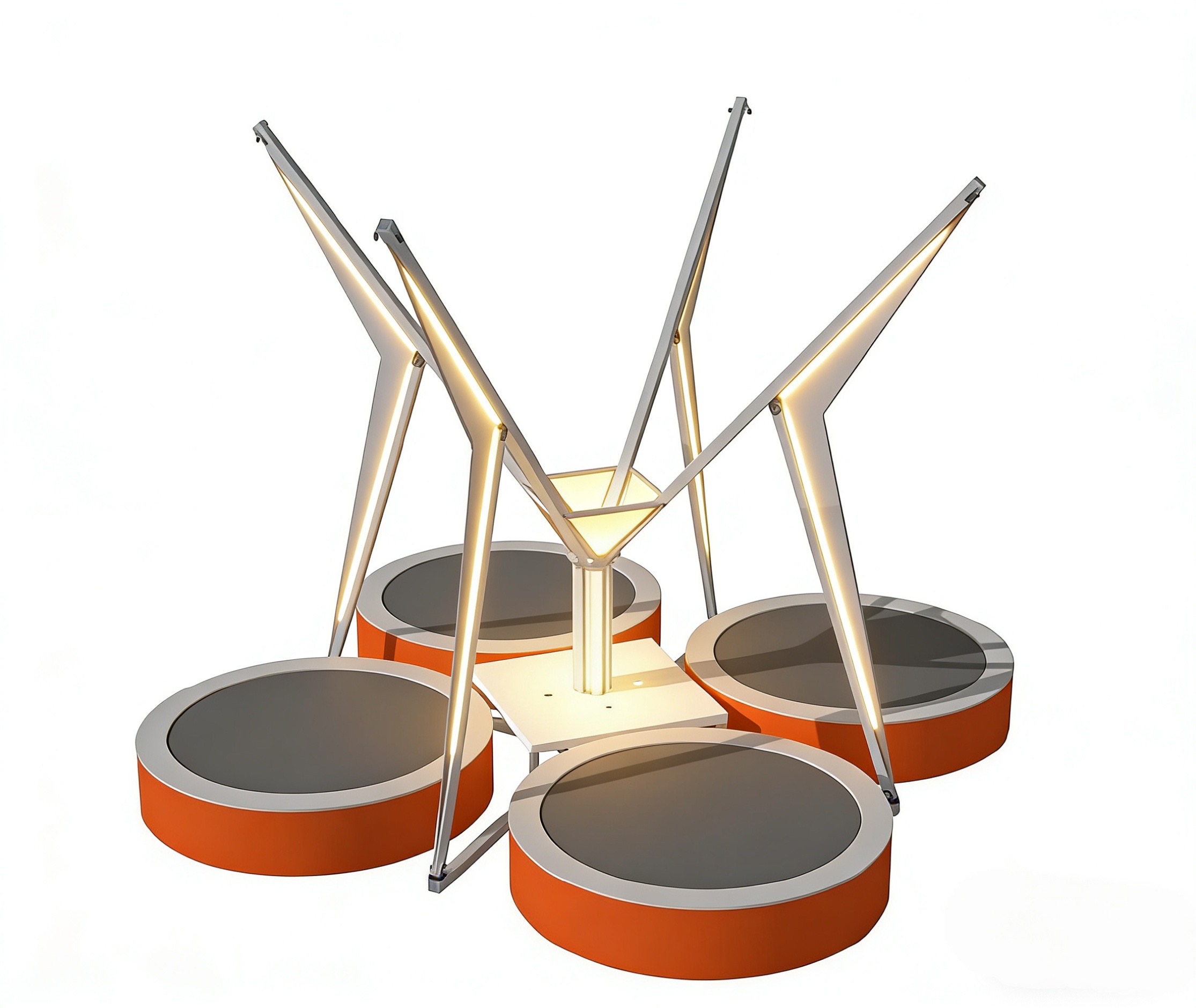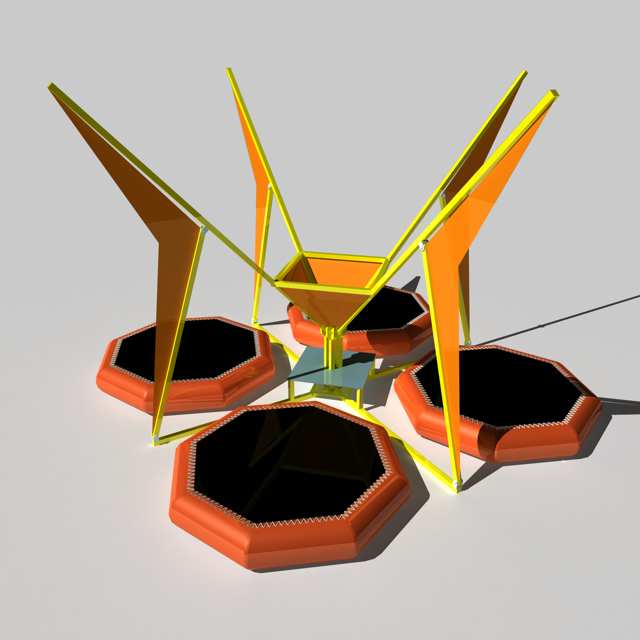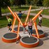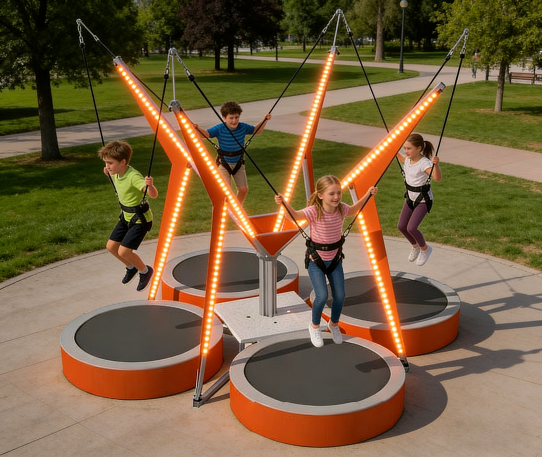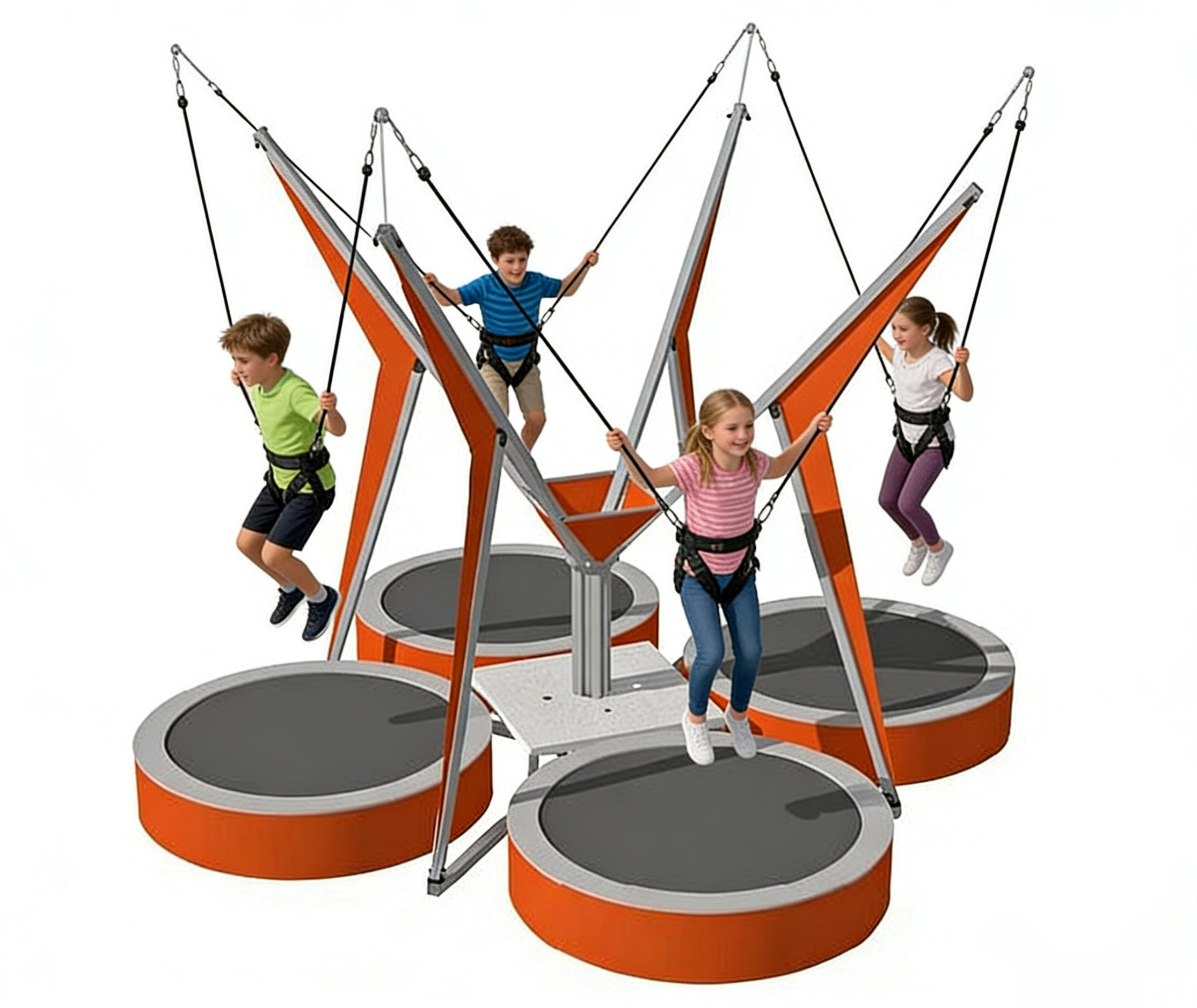This kids’ mini bungee ride has a footprint of about 4m × 4m (square), based on 4 evenly distributed trampolines. The size can be slightly adjusted according to the actual site conditions for flexible installation.