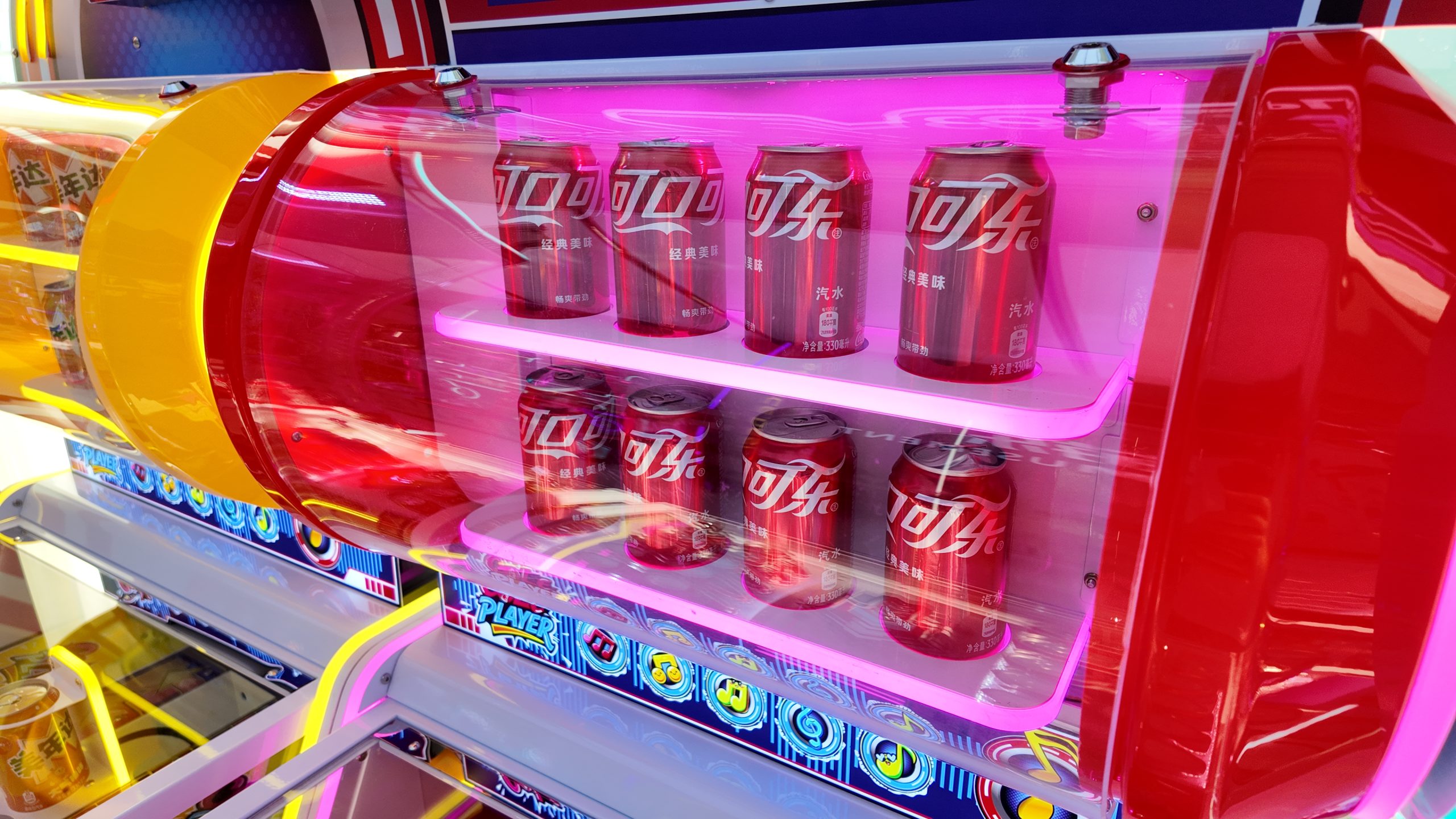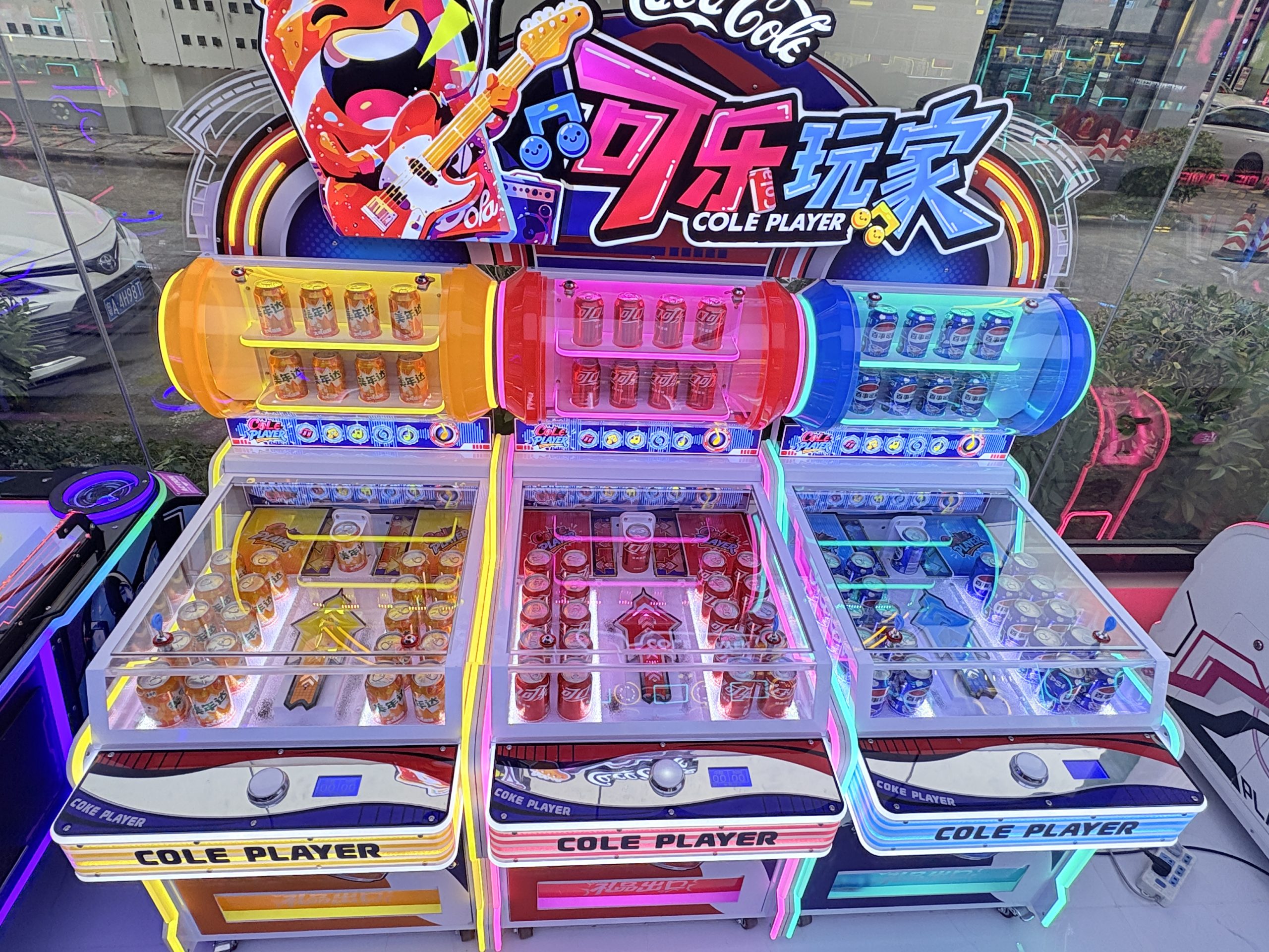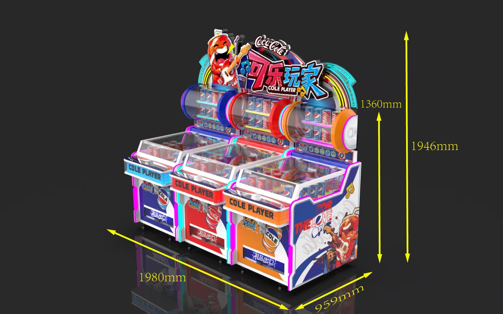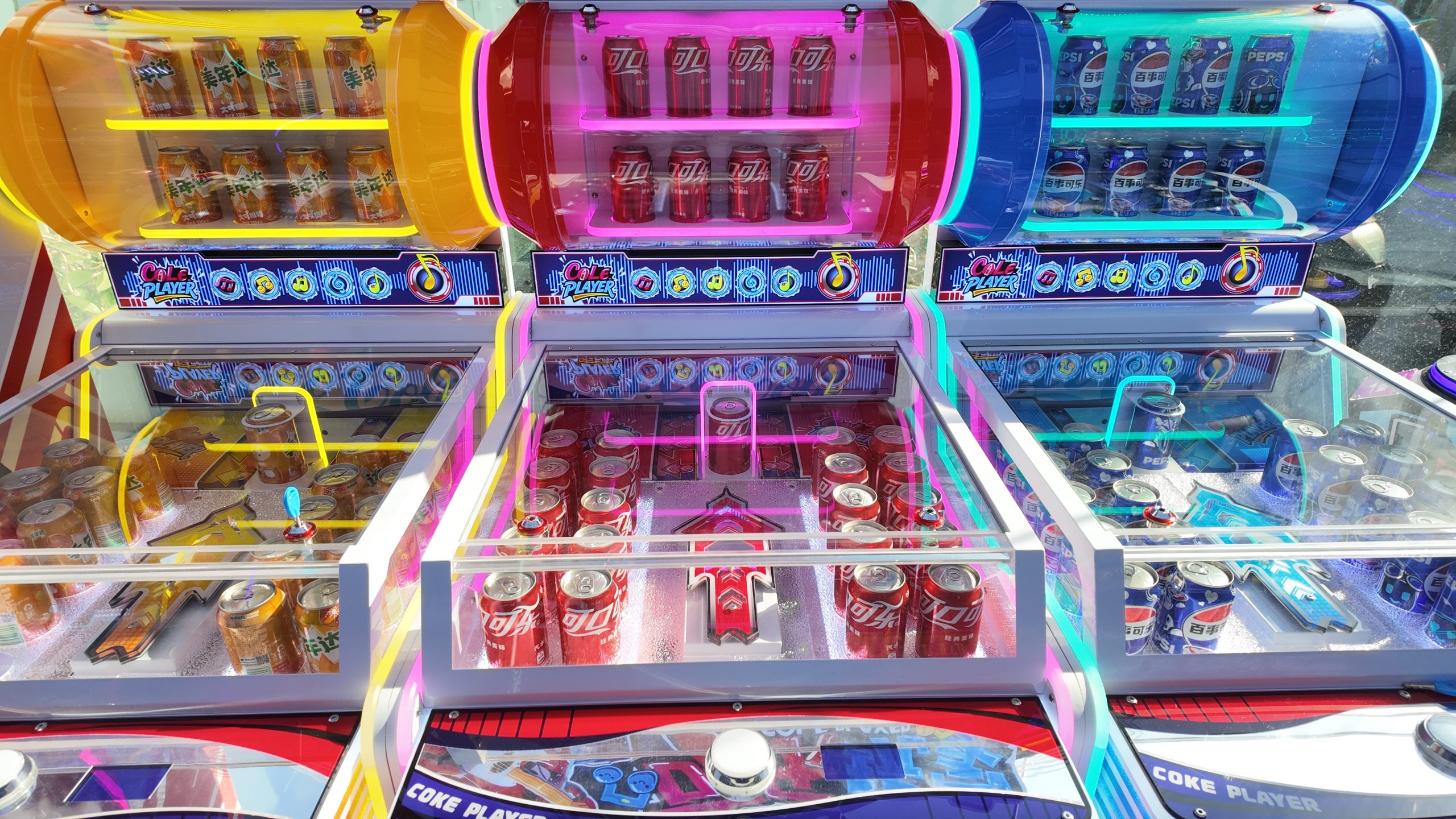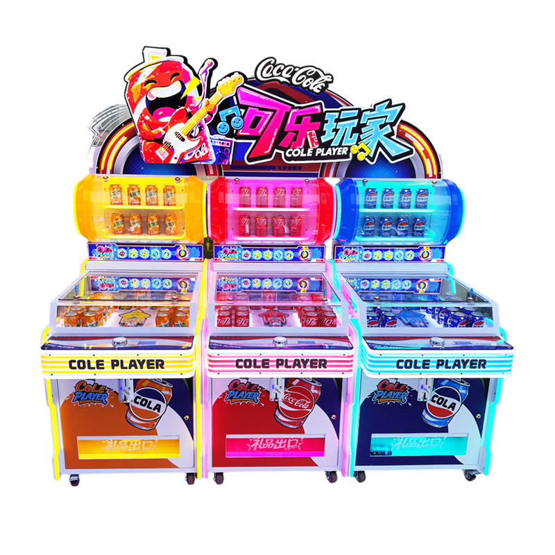 Three-person Coca-Cola themed beverage machine, equipped with a refrigeration system inside. Aim at the beverage model moving left and right in front, press the button and the arrow will shoot forward. If the arrow hits the beverage model and makes it fall down, you can get a bottle of beverage.