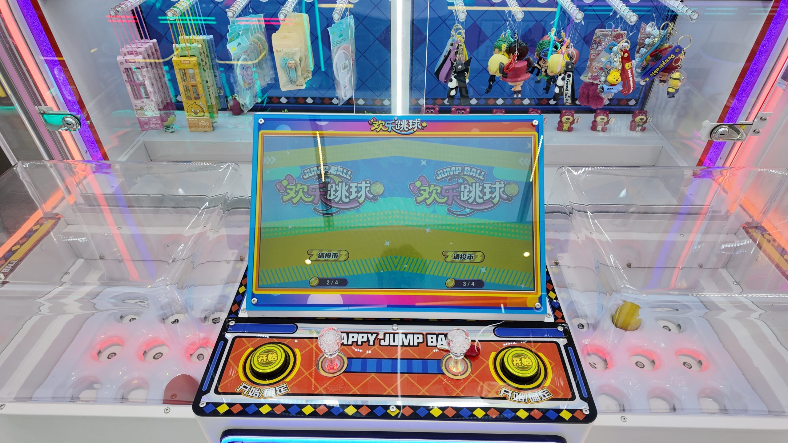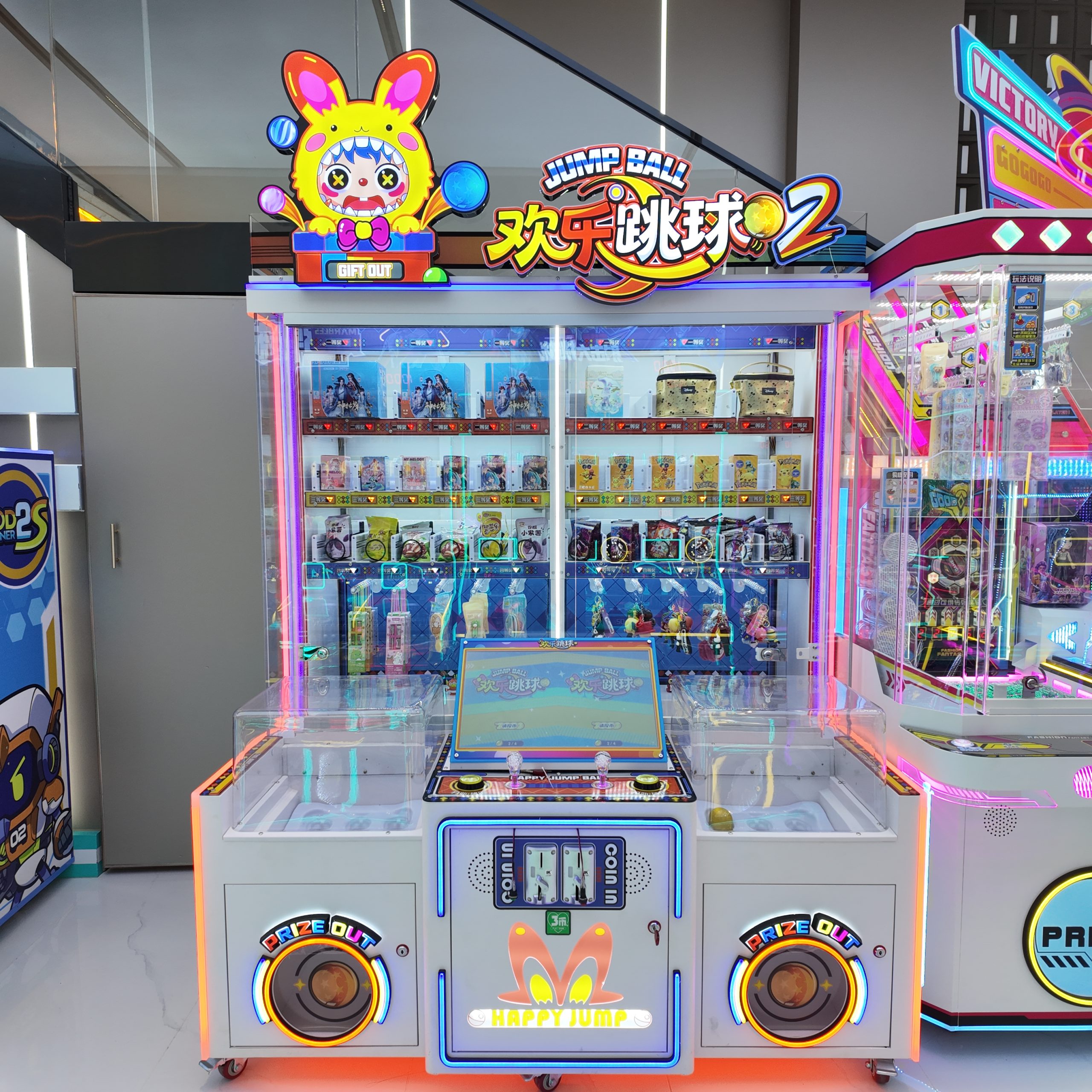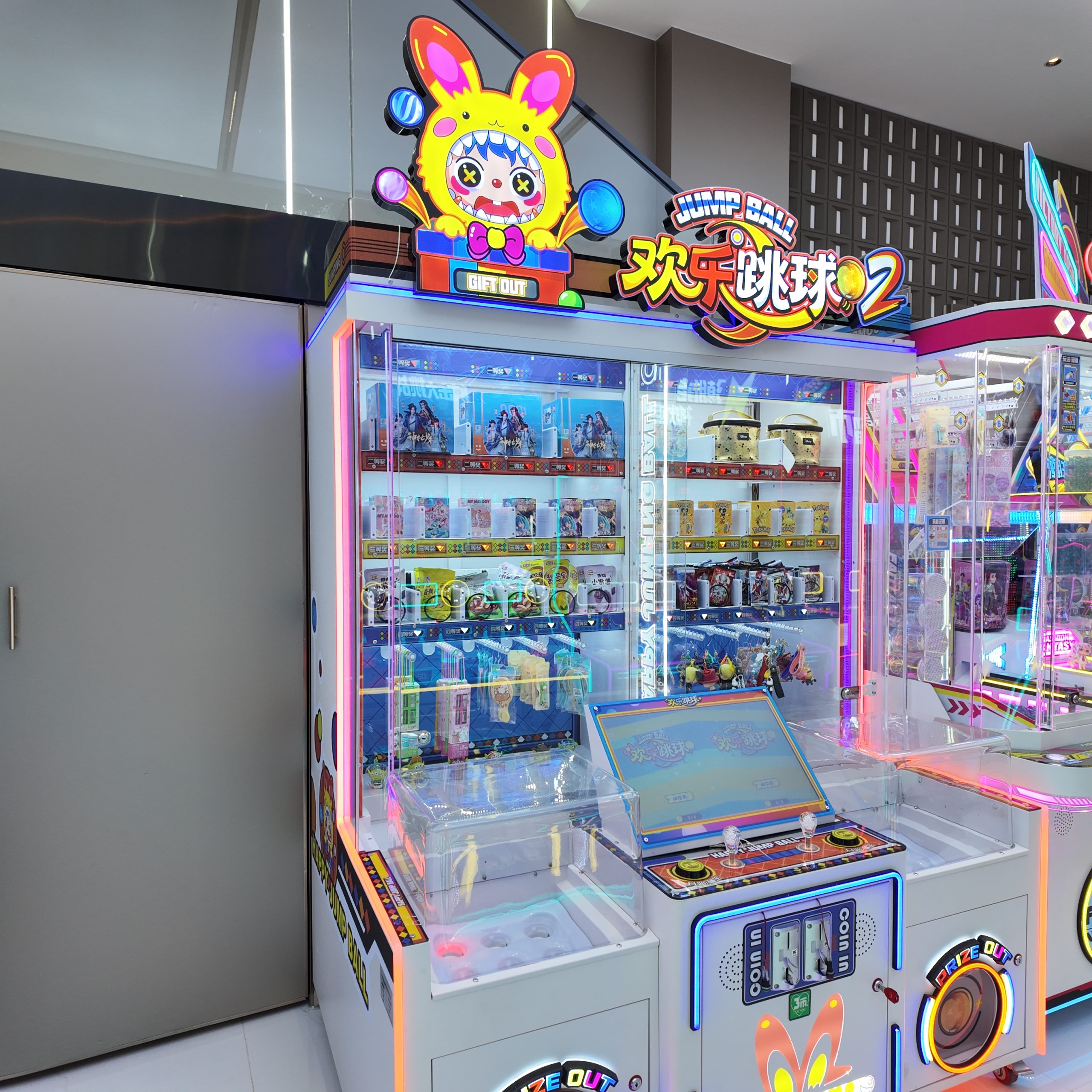 3-player gift machine. Players throw small balls into the moving baskets, earning corresponding points which can be used to exchange for gifts.