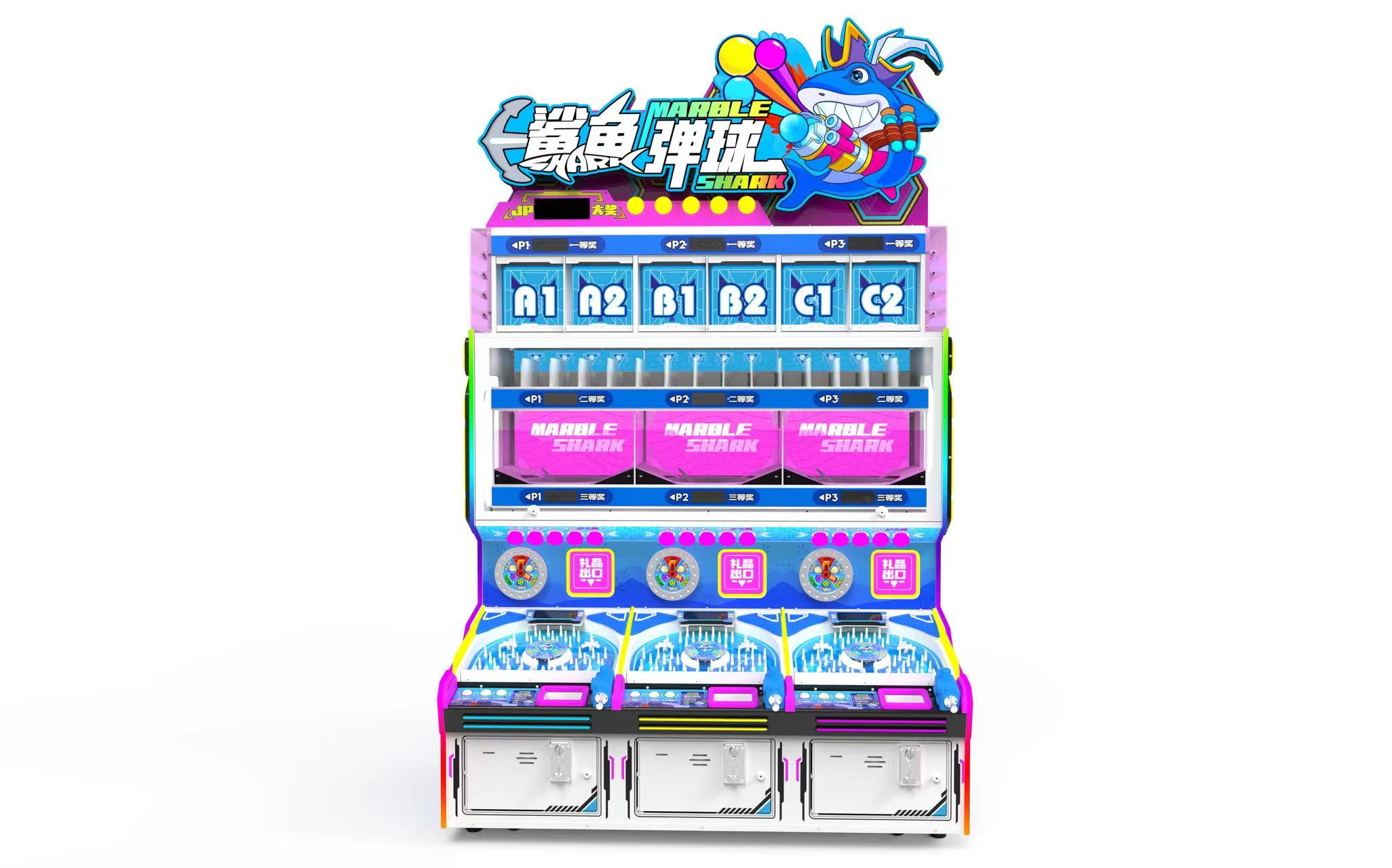 3-person gift machine. Score points by shooting marbles through the lever. Exchange points for exquisite gifts.