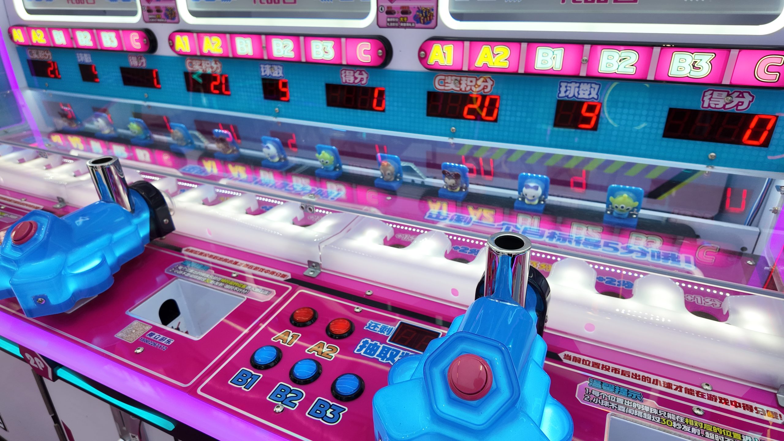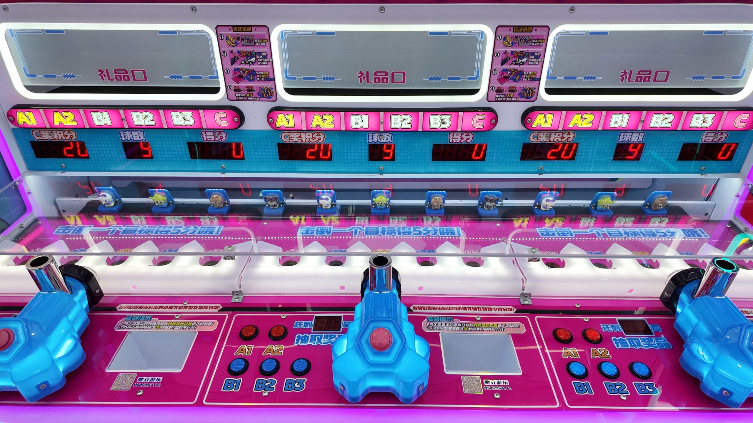 Three-player shooting game, score by knocking down dolls.