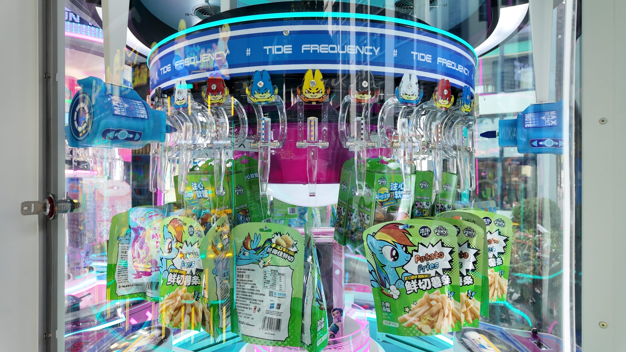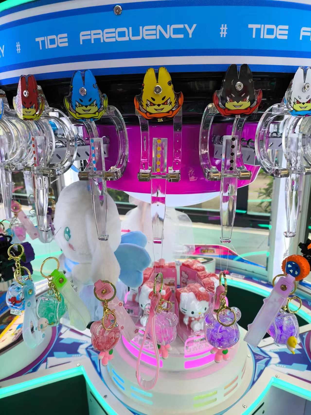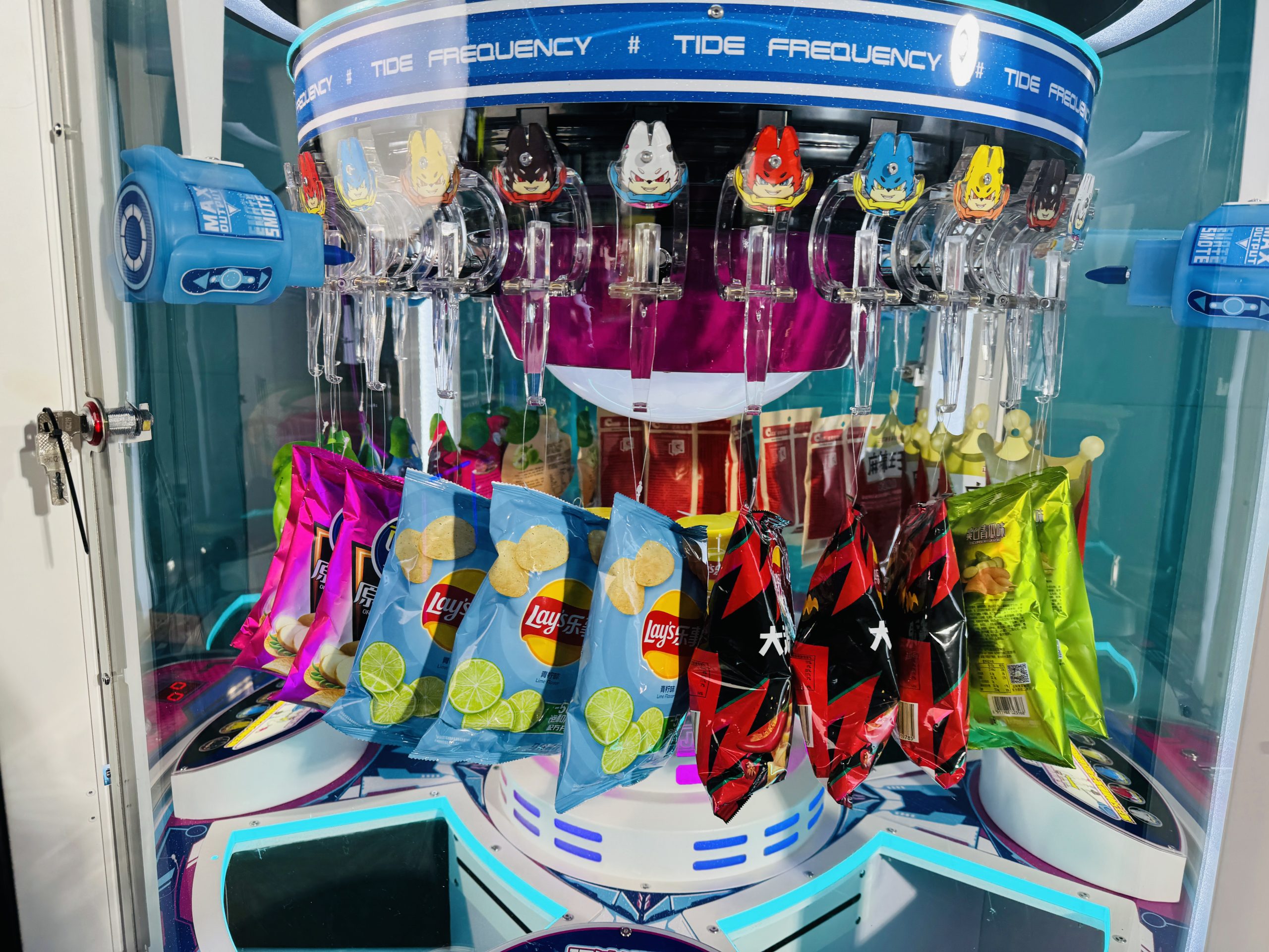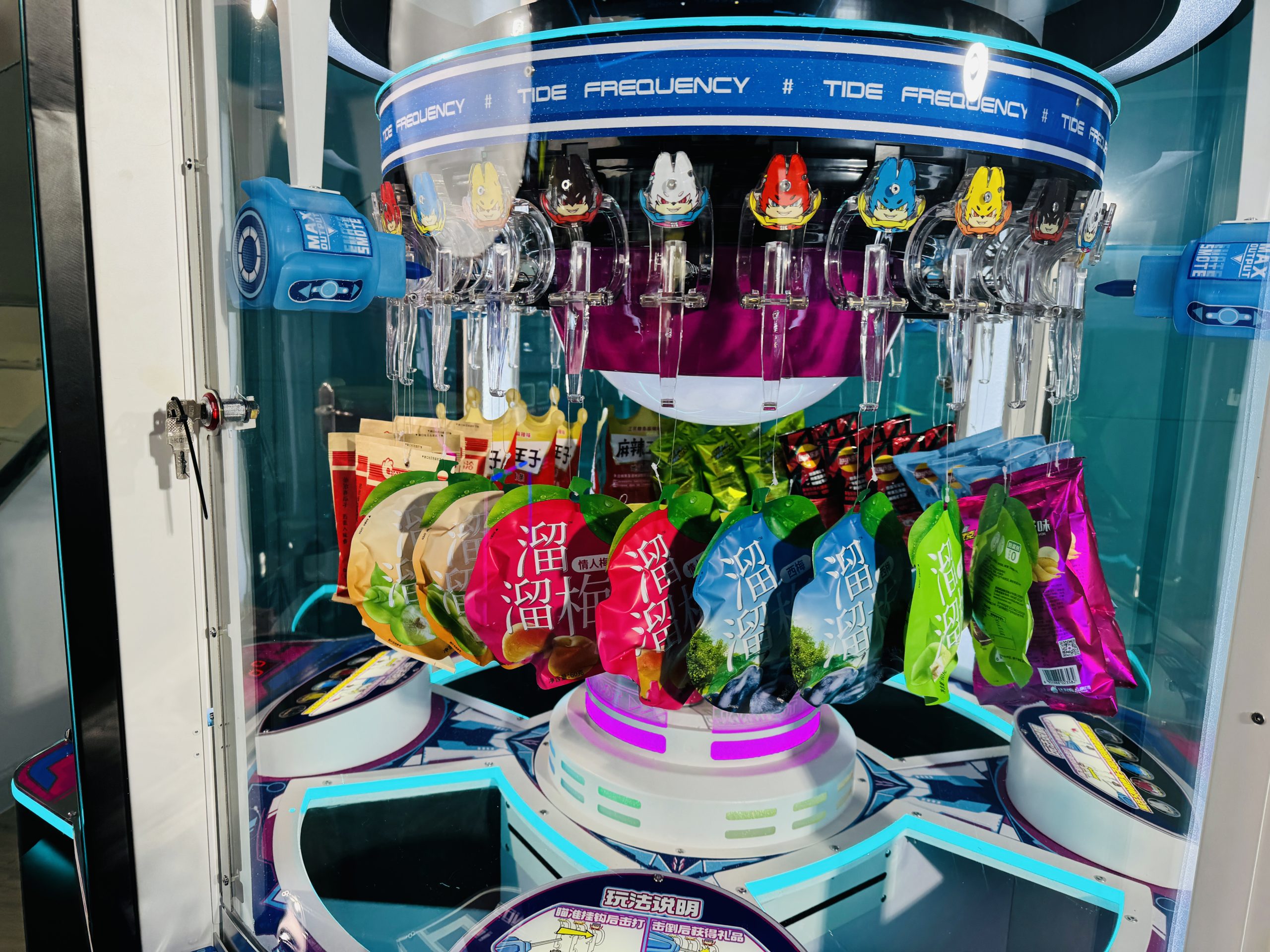 A four-player gift machine. When players press the start button, they can draw an outer hook and receive a small gift. If they collect 5 cartoon lights, they can obtain an inner grand prize, which may include rewards such as snacks, keychains, and toys. It has strong interactivity and a fast return-on-investment cycle.