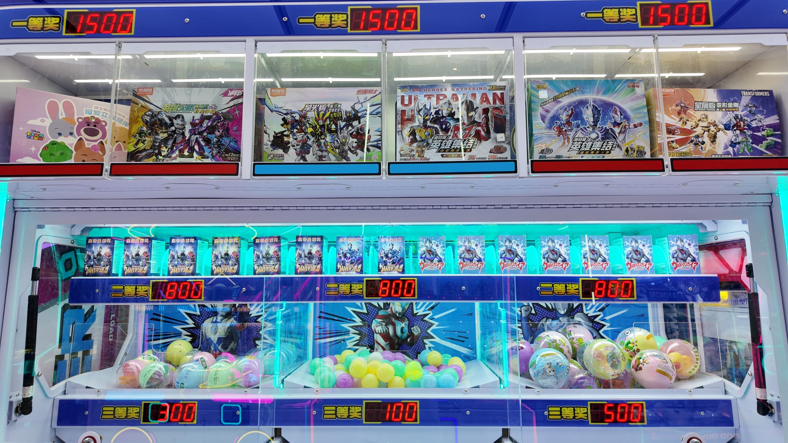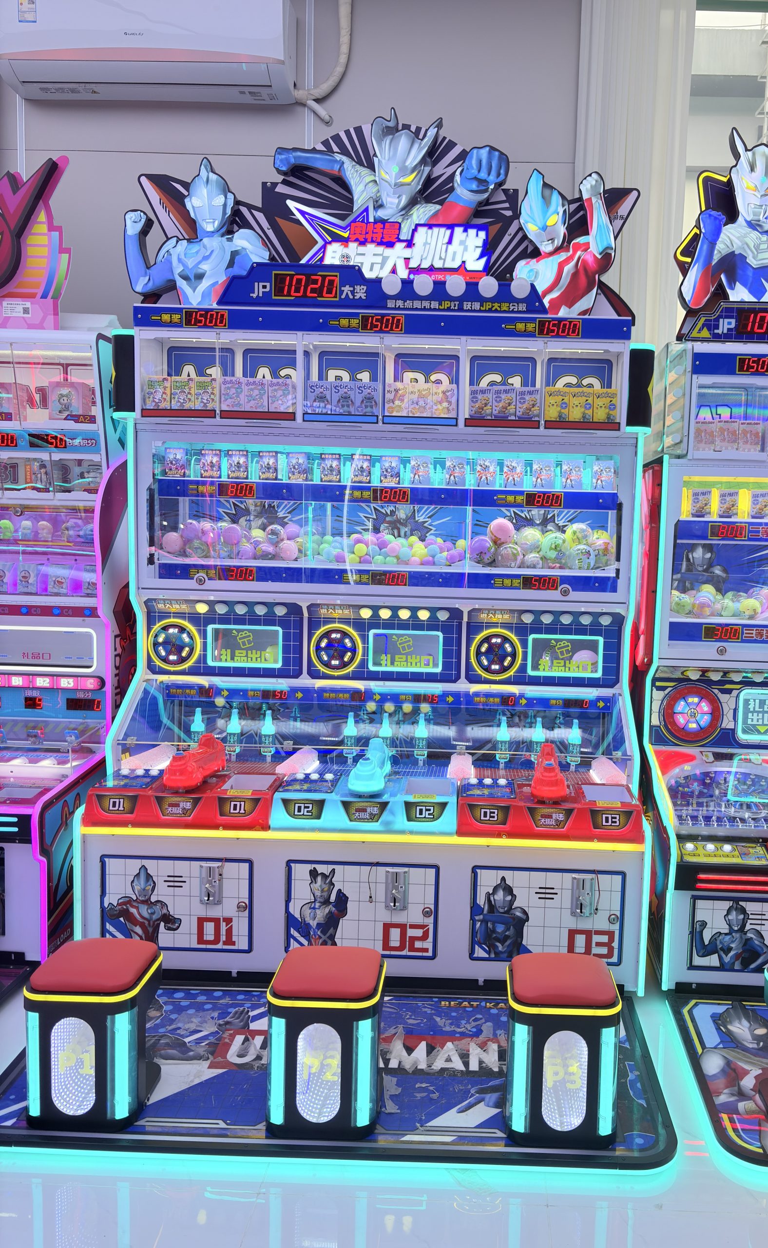 3-person gift machine. Players press buttons to launch small balls to earn points. These points can be used to exchange for exquisite gifts